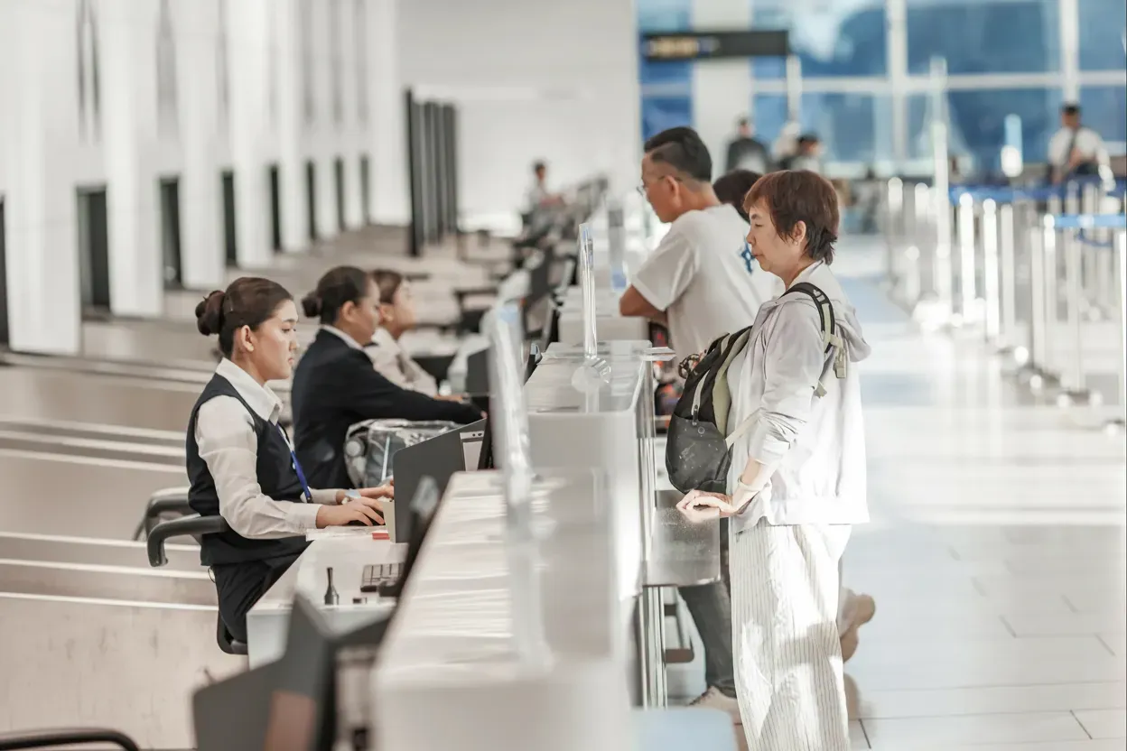 Have your passport, booking confirmation and travel documents ready. Staff will issue your boarding pass and take any checked luggage.