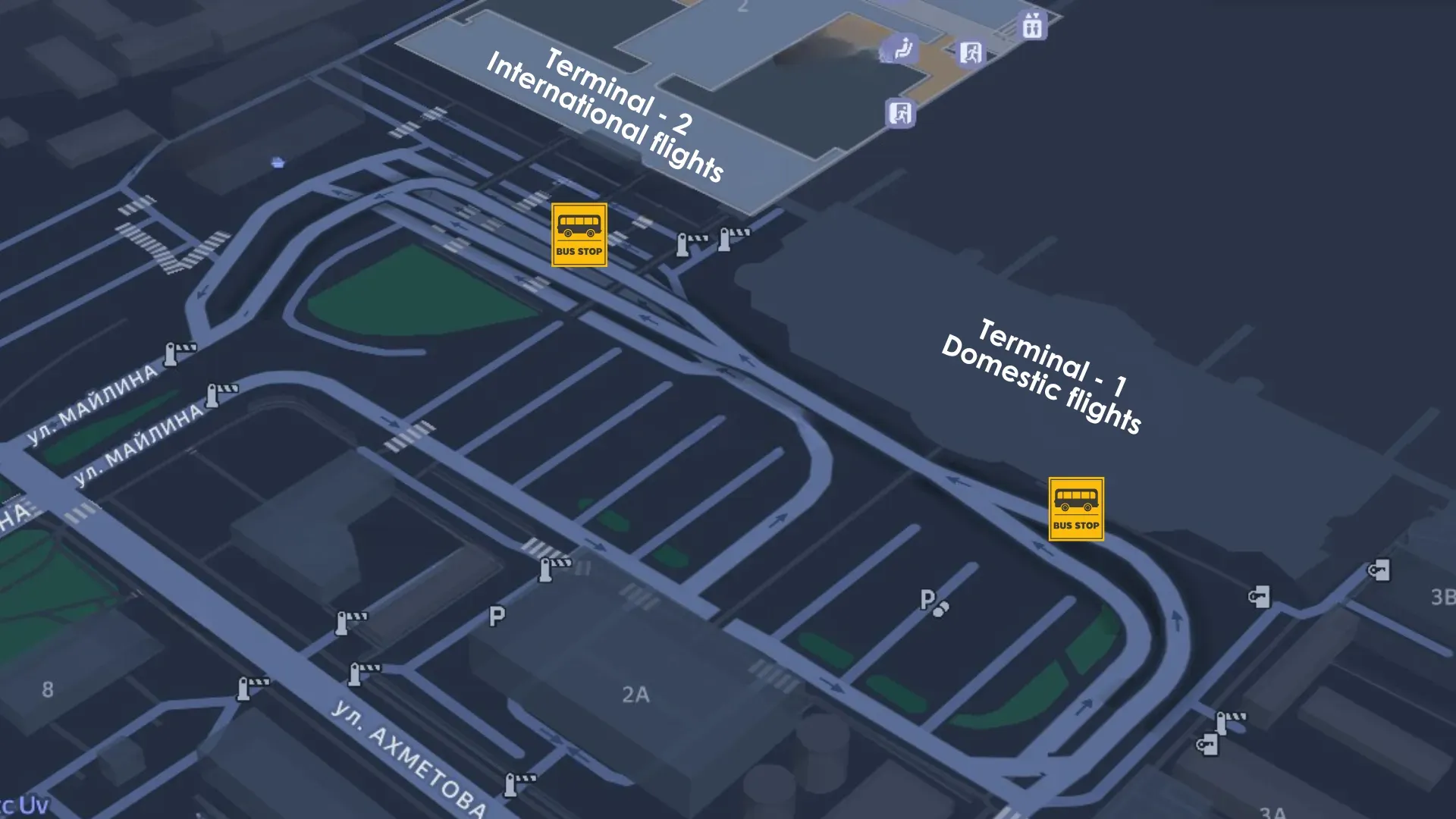 Автобус бекеті келулер залынан сыртта, терминалдың дәл алдында орналасқан.